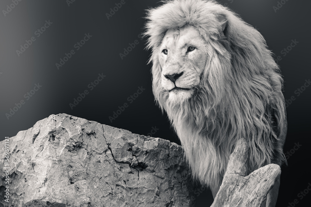 Grayscale lion portrait, looking forward, standing with rock and tree trunk on dark blurred background. Wild animals, big cat profile