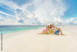 A family with two toddler children sit on sand beach on summer holiday.