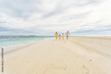 Young family on holiday have a lot of fun barefoot on the beautiful beach.