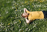 Spring allergies. A Young man sneezing amidst a blooming flowers, symbolizing spring allergies. Young male laying in green grass. Spring fatigue sleep and calm nap in allergy season.