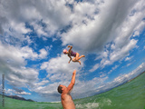 father and daughter play on the beach. Sea vacation fun.