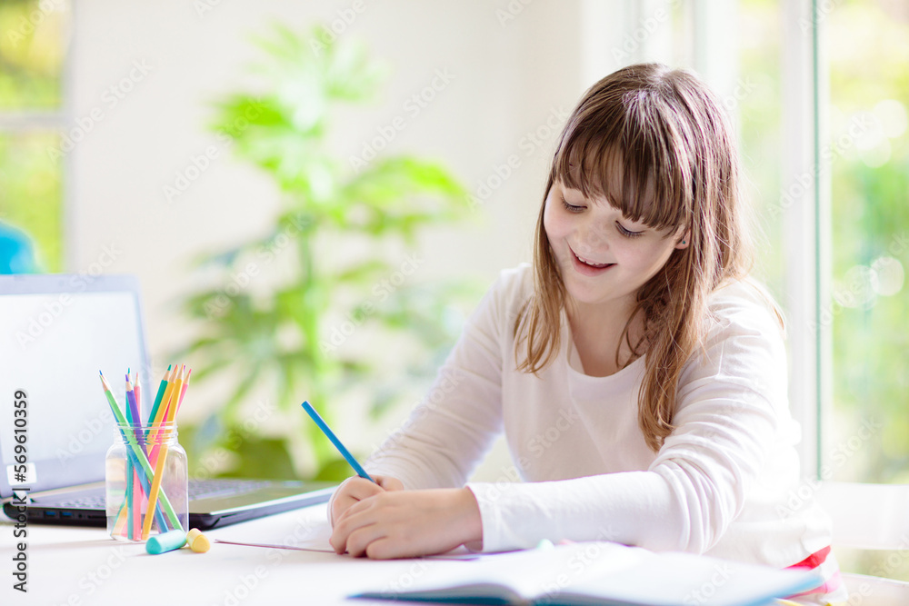 Online remote learning. School kids with computer.