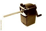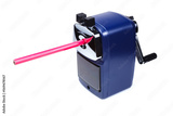Rotary pencil sharpener with rose colored pencil on white background.