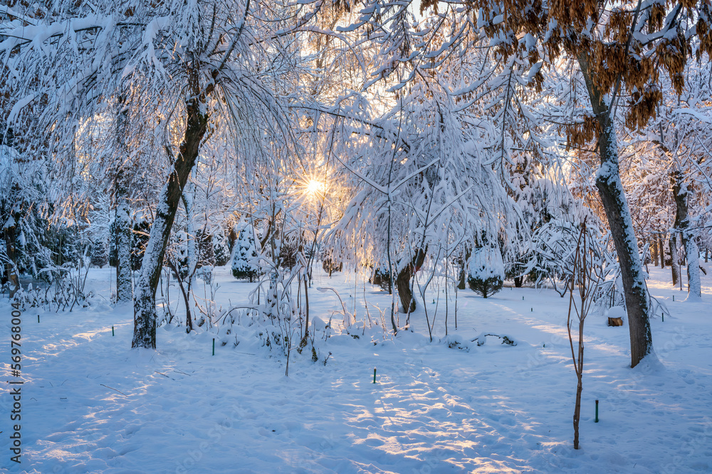 Sunset or dawn in a winter city park with trees covered with snow and ice.