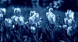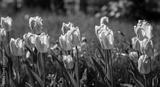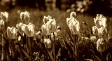 Purple tulips lit by sunlight on a flower bed. Landscaping.