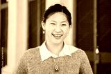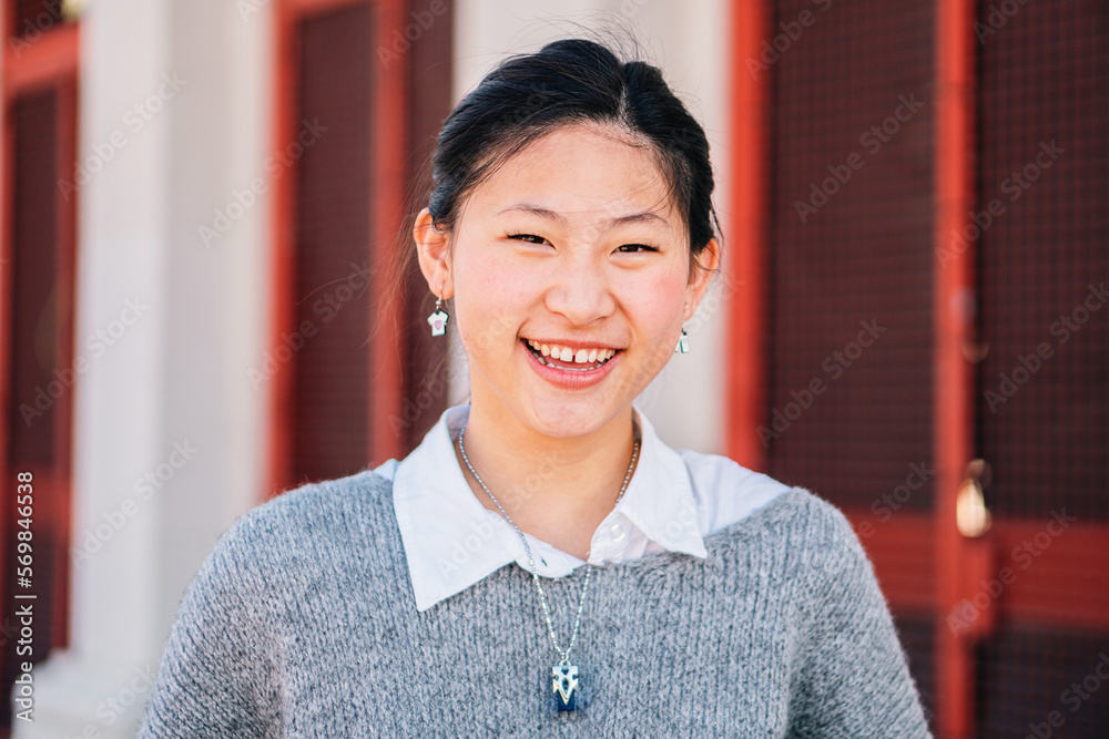 Close Up Portrait of happy Asian girl looking at camera. Chinese lady smiling and laughing outdoors. High quality photo