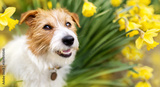 Happy cute pet dog smiling in easter daffodil flowers. Spring forward, springtime banner, background.