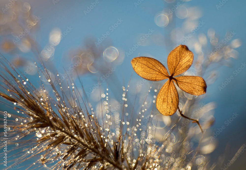 Jesienna impresja, kwiaty Hortensji na niebieskim tle
