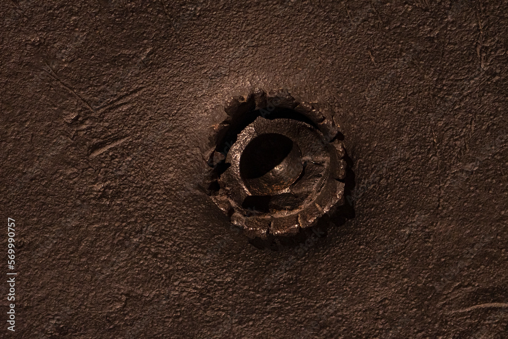 A hole in the armored iron with a piece of shell from the Second World War.