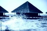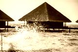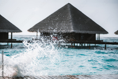 The shot is taken with a selective focus on the water splashing against a wooden footpath, leading to an overwater bungalows with an elegant design featuring thatched roofs, in the Maldives