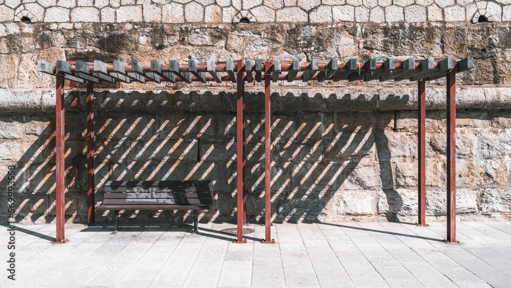 A garden bench is vandalized with graffiti and above it, a cherry-colored wooden structure with strips, the sun passing through the spaces creates a shadow with striped effects on a stone background