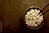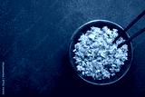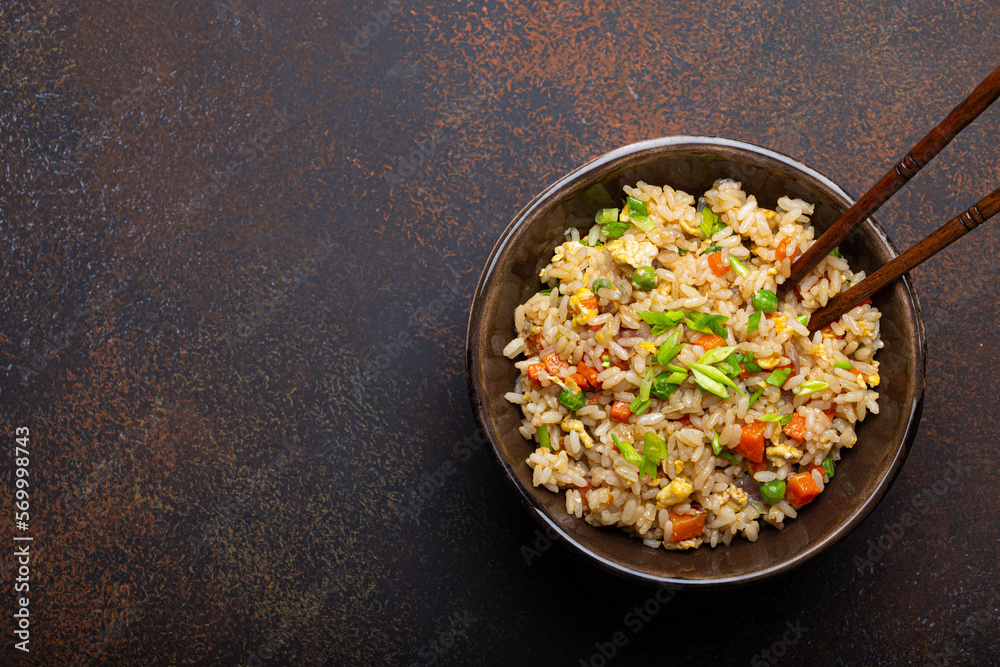 Authentic Chinese and Asian fried rice with egg and vegetables in ceramic brown bowl top view on dark rustic concrete table background. Traditional dish of China, space for text