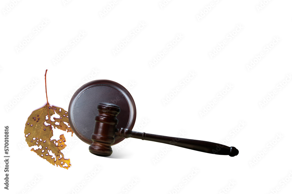 Abstract photo with wooden gavel and damaged green leaf isolated on white background