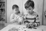 Siblings boy and girl small caucasian child brother and sister play at home with piggy bank saving money childhood investment insurance and finance concept copy space