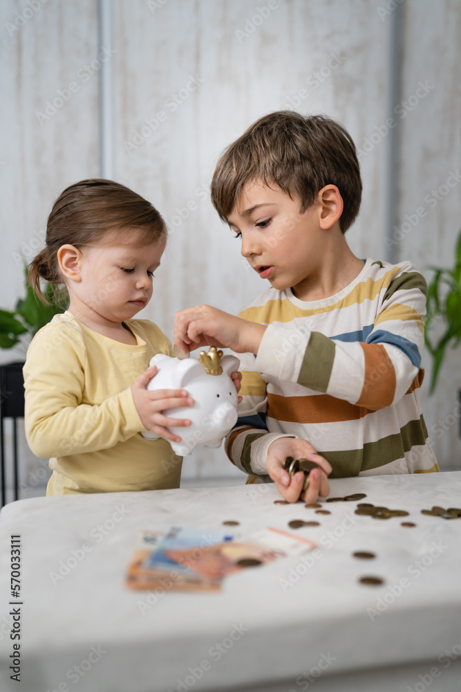 Siblings boy and girl small caucasian child brother and sister play at home with piggy bank saving money childhood investment insurance and finance concept copy space