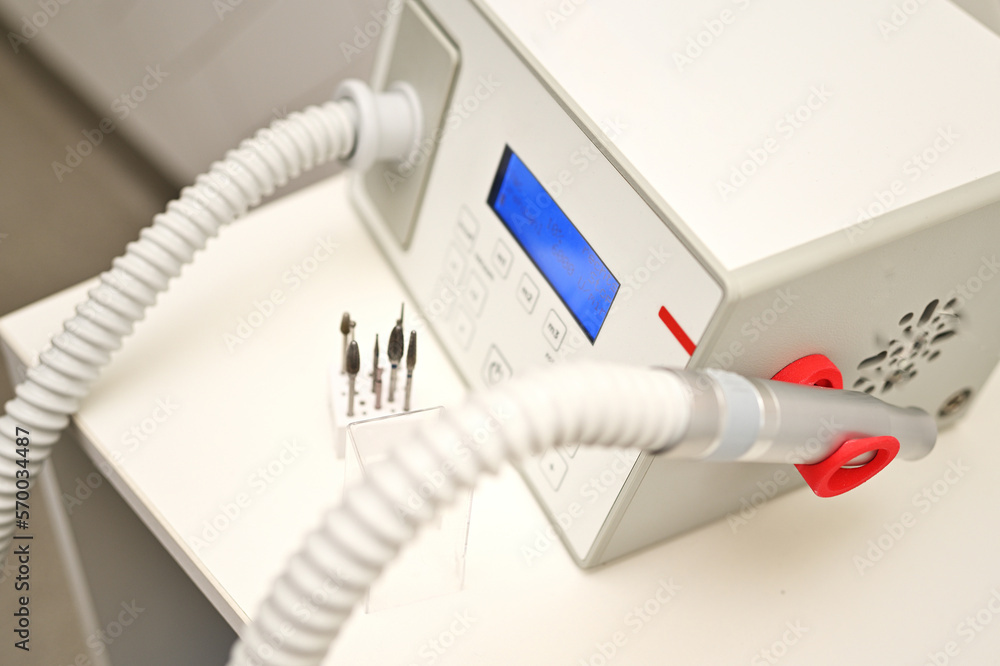 close-up - pedicure machine with a set of nozzles drills saws for the treatment of onychomycosis