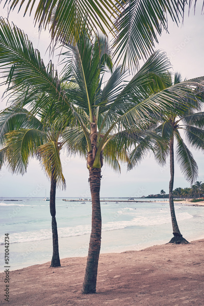 Coconut palm trees on a tropical beach, color toning applied, Mexico.