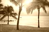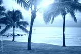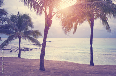 Coconut palm trees on a tropical beach at sunset, color toning applied, Mexico.
