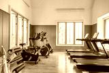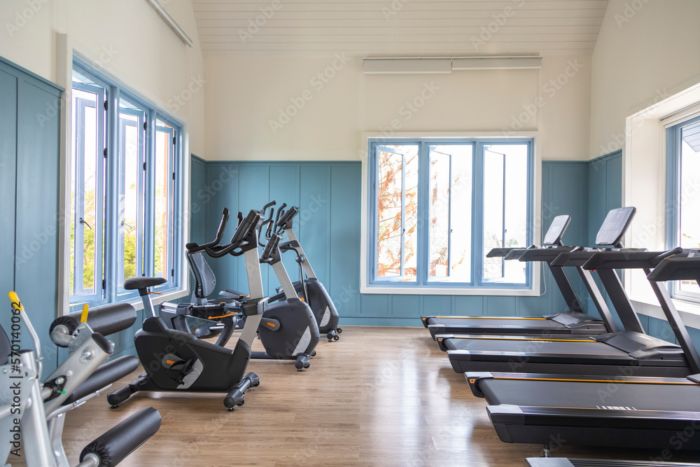 Treadmills set in gym interior. Fitness club with equipment. Sports background with glass windows