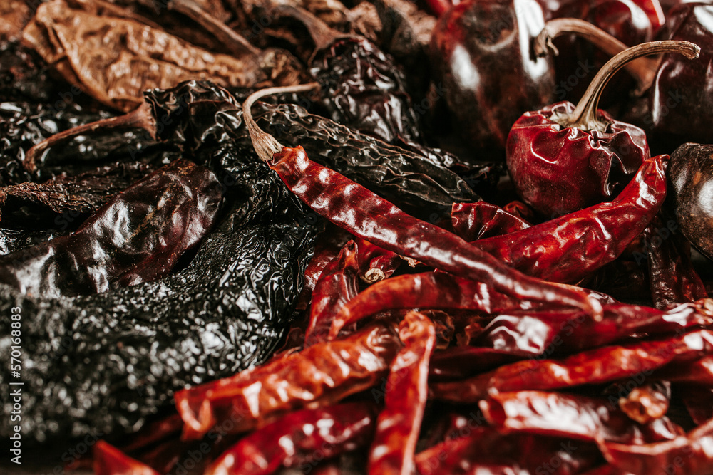 Mexican Pods of dried chili peppers in a wooden plate in Mexico Latin America