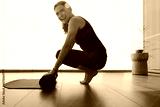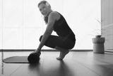 Mature woman smiling while folding up an exercise mat at home