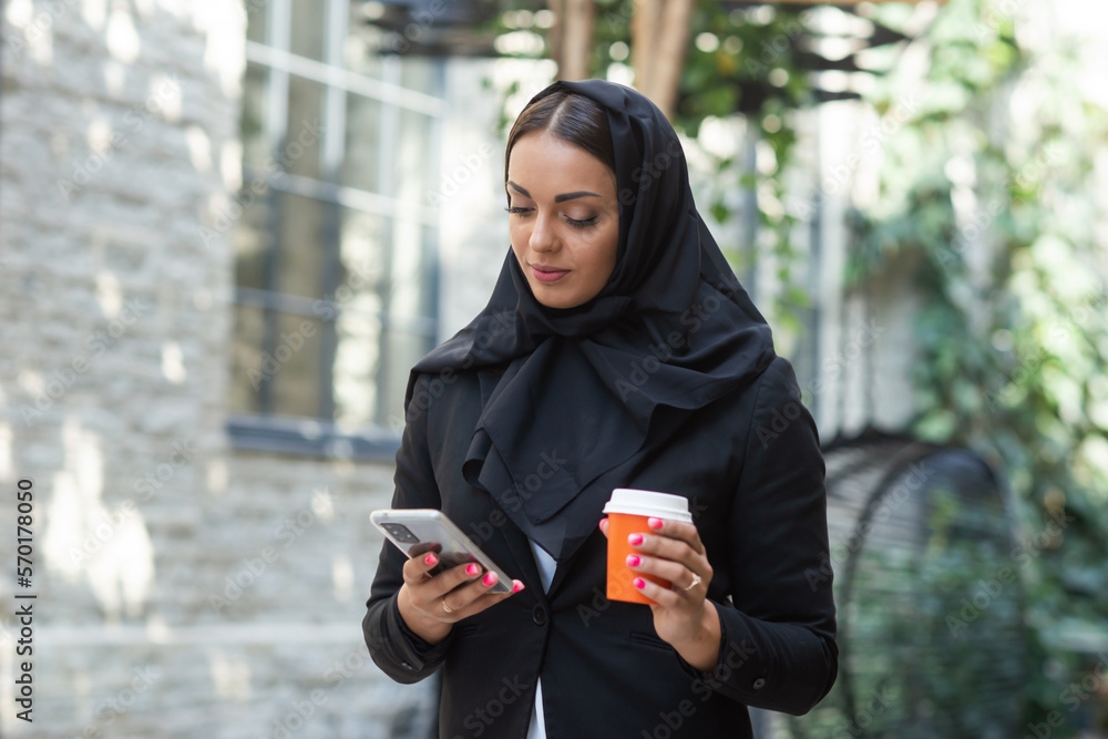 Close-up portrait of young and attractive muslim woman in hijab. Middle Eastern woman outdoor on the street. City background. Business concept.
