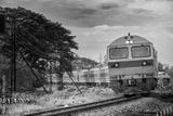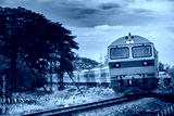 Passenger train by diesel locomotive passes the railway curve.