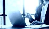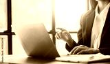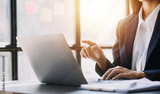 Asian Business woman using calculator and laptop for doing math finance on an office desk, tax, report, accounting, statistics, and analytical research concept