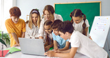 Children in class at elementary school with teacher working together on laptop in classroom. They study the basics of computer literacy standing near desk. Education using technologies concept.