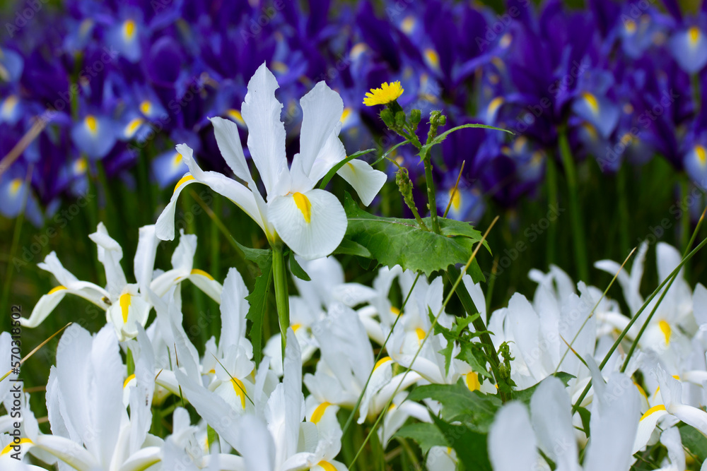 White and blue Irises Hollandica wallpaper. Ornamental hybrid beautiful bulbous bulb plants blooming in spring botanical garden, summer flower bed. Flower festival in spring season. Blooming beauty.