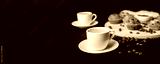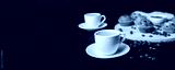 Dos tazas de café, desayuno con muffins de chocolate, en una bandeja de madera, granos de café en fondo banner largo azul oscuro