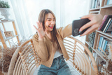 Happy asian woman face smiling on smartphone camera waving hand while taking selfie photo at home.