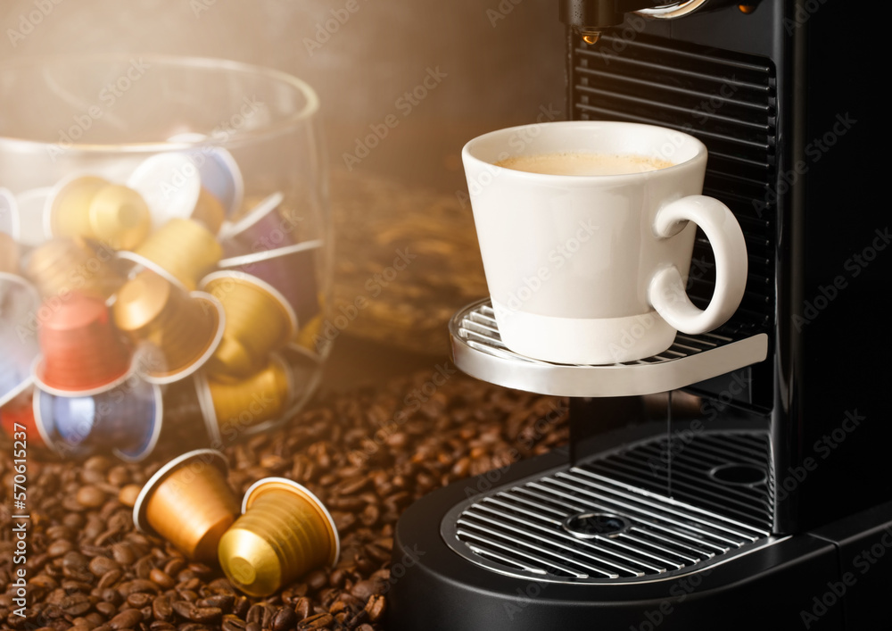 Coffee capsules pods on raw beans with espresso cup and home coffee machine.