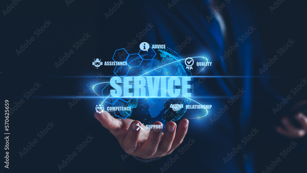 Business service online digital technology. Businessman touching digital globe hologram. Quality business relationship. customer service advice and support. Technology robot assistance online services