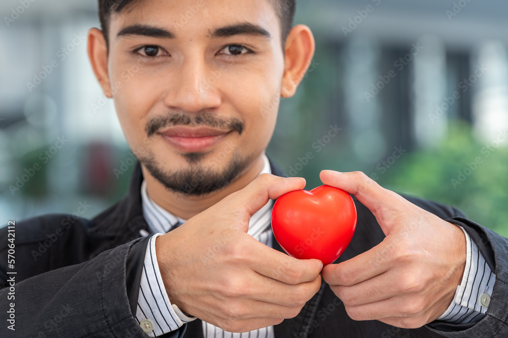 man in suit holding red present heart symbol for give gift to woman secretary lover in valentine day. businessman carry red heart present in hands for romantic date at valentine.
