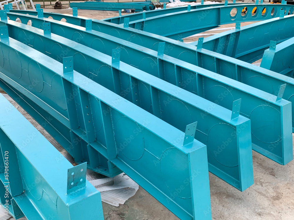 The blue steel columns and beams structure.