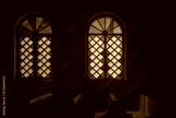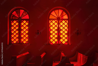 Vintage stained glass window in red wall in church. Interior design concept.