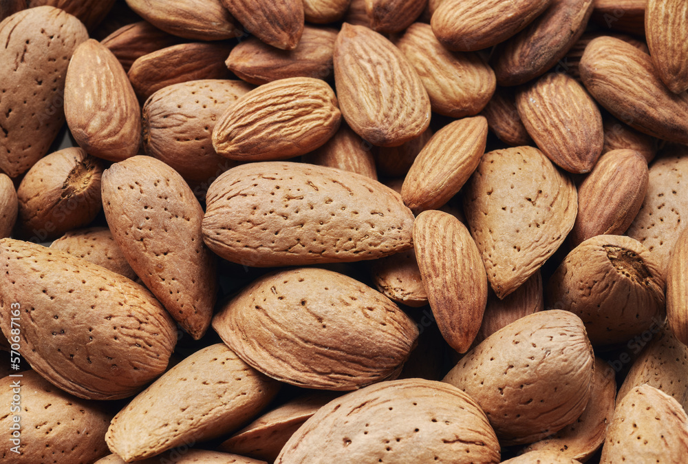 Close up picture of almonds, food background, selective focus.