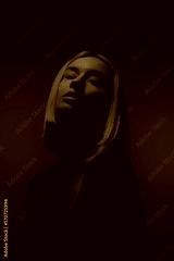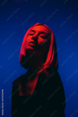 Young female with fair hair looking at camera against blue backdrop in studio with neon illumination
