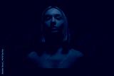 Young female with fair hair looking at camera against blue backdrop in studio with neon illumination