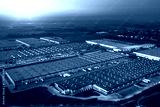 Top view of warehouses, aerial view of large logistics warehouses in the evening