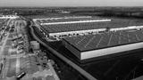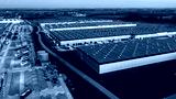 Top view of warehouses, aerial view of large logistics warehouses in the evening