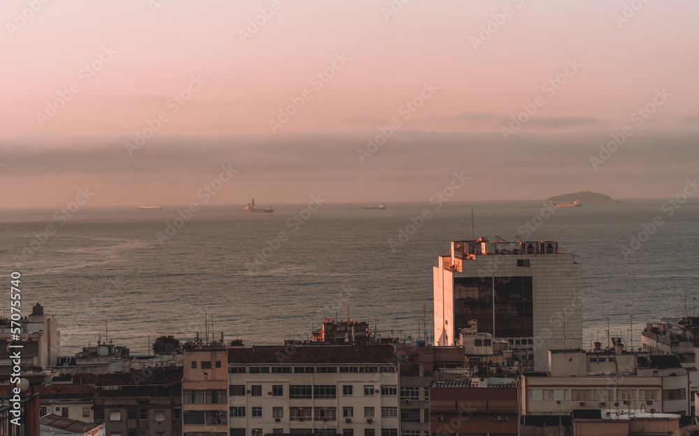 Low-key photo of the ocean as it blends with the pink sky in this sunset shot. The degraded buildings in the foreground contrast with the serene sea, while boats drift peacefully in the distance