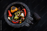 Mexican Mortar with burnt chilies and ingredients for sauce, spicy food in Mexico city Latin America