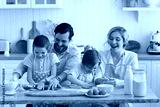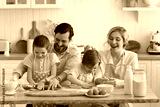 Cheerful happy couple of parents and two cute little kids in aprons teaching to bake, rolling, shaping dough. Children helping mom and dad to prepare dessert, pie, pastry food,