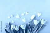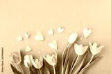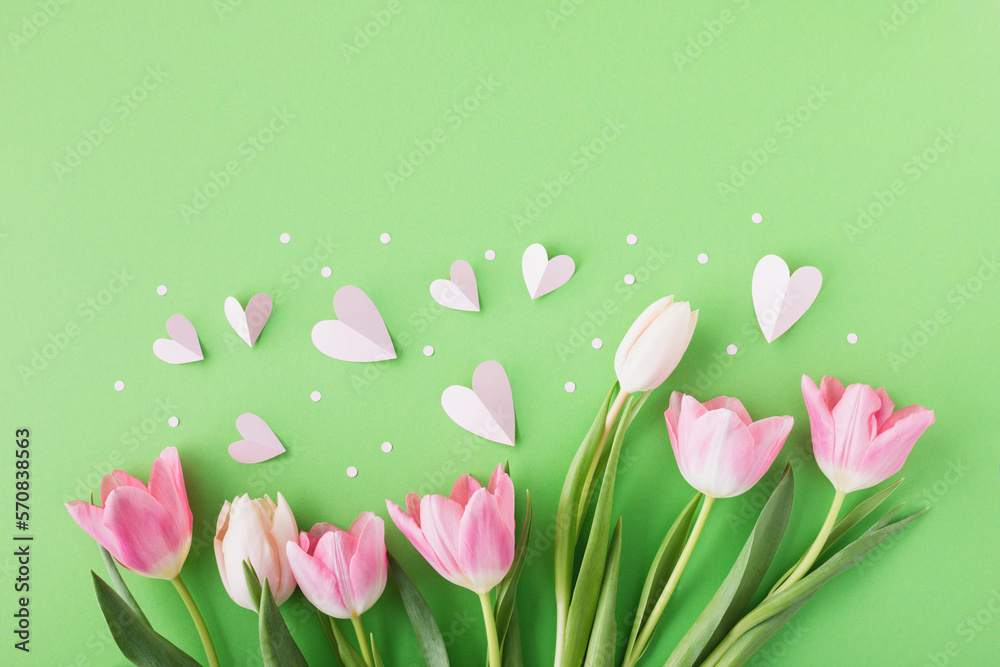 Spring tulip flowers with pink hearts on pastel background top view. Greeting card for International Women Day, Mother day. Flat lay.