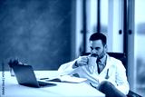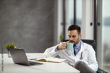 Portrait of doctor talking to online patient at clinic office giving online consultation for domestic health treatment