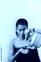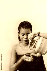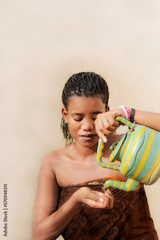 Pretty woman wearing a loincloth and toileting (using a teapot). Young Afro beauty, 19 years old, braided hair, photo