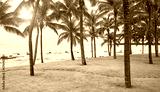 Tropical beach with coconut palm trees at sunset, color toning applied.