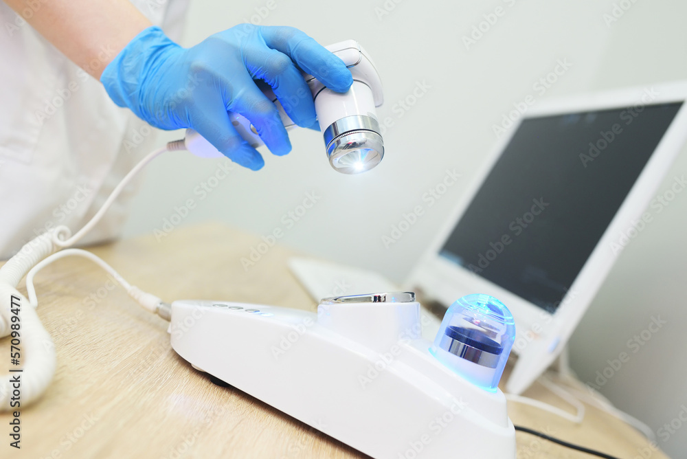 a close-up of a cosmetologist trichologist holds a device for computer diagnostics of the condition of hair and scalp.